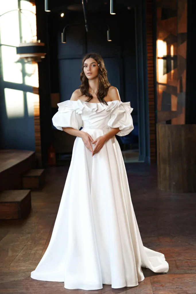 - пышное платье А-силуэта из фатина, отличающееся рукавами воланами и цветочной нежной аппликацией. V-образный вырез на корсете придает образу женственности, а легкая летящая ткань романтичности.